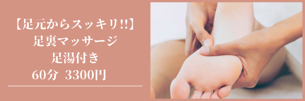| 足湯+足裏マッサージ | 60分 | 3,600円 | 足裏60分のしっかりもみほぐしコースです。 |