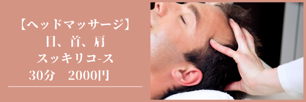 ヘッドマッサージ30分2,000円頭皮をしっかりともみほぐして血流改善、顔のむくみ改善などを行います。